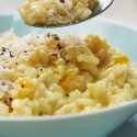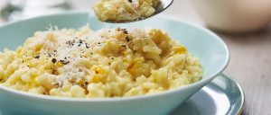 Delicioso plato de arroz tostado con un sofrito de cebolla y aceite al que se le añade caldo poco a poco, condimentado con parmesano rallado y azafrán.
