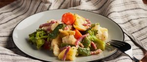 200 g patatas harinosas100 g coliflor200 g zanahorias150 g judías verdes100 g brócoli2 dientes de ajo0.5 cebolla3 cuch. aceite de oliva100 g jamón serrano / en taquitos0.5 cuch. harina de trigo 150 ml caldo de pollo / alternativamente, caldo vegetal6 alcachofas de bote3 cucharaditas sal